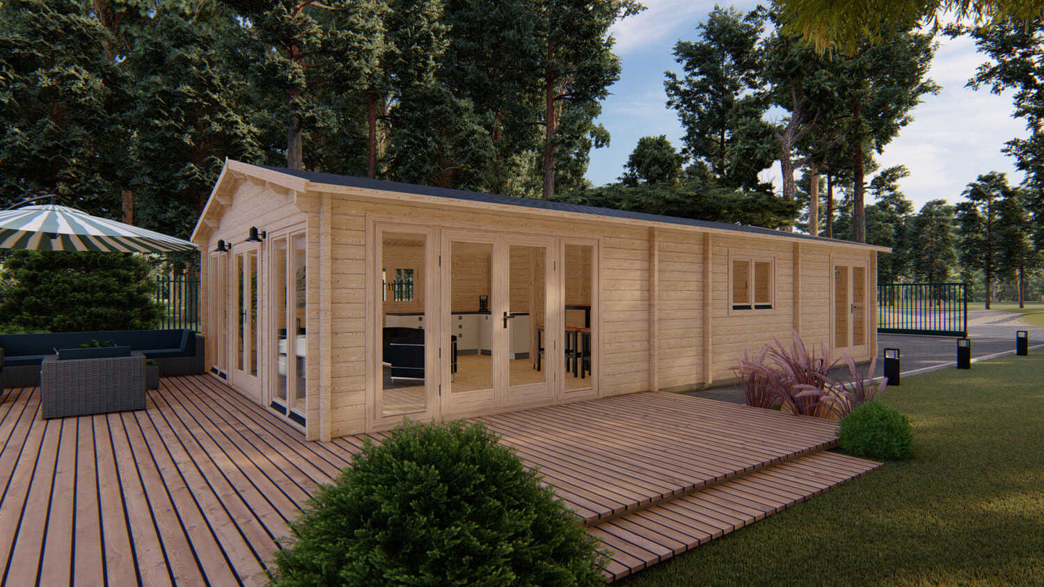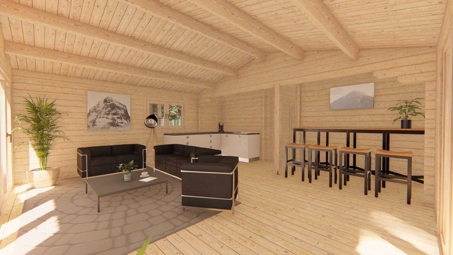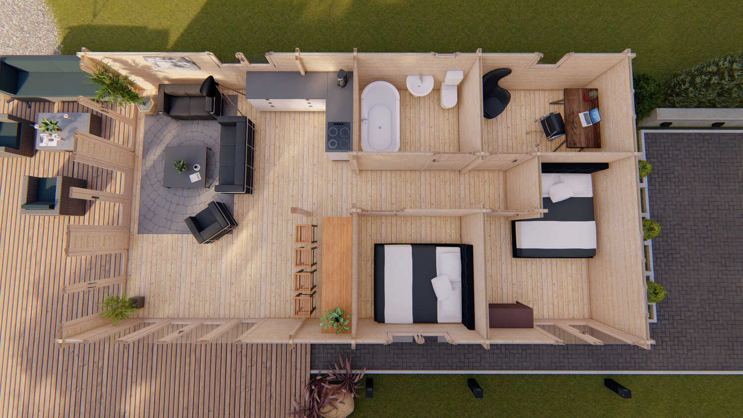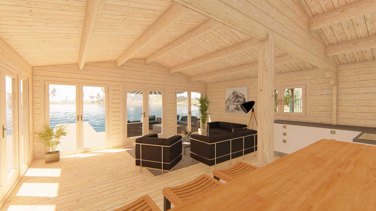 Esta acogedora casa de campo de 62 m² dispone de tres dormitorios, un baño y una espaciosa sala de estar. Su diseño se enfoca en aprovechar la luz natural, con numerosos ventanales altos que crean un ambiente luminoso y ventilado.