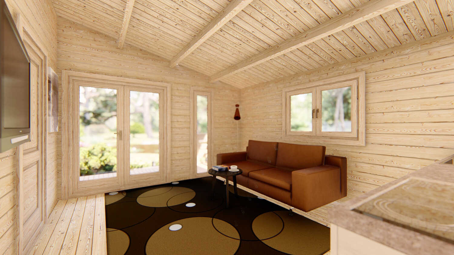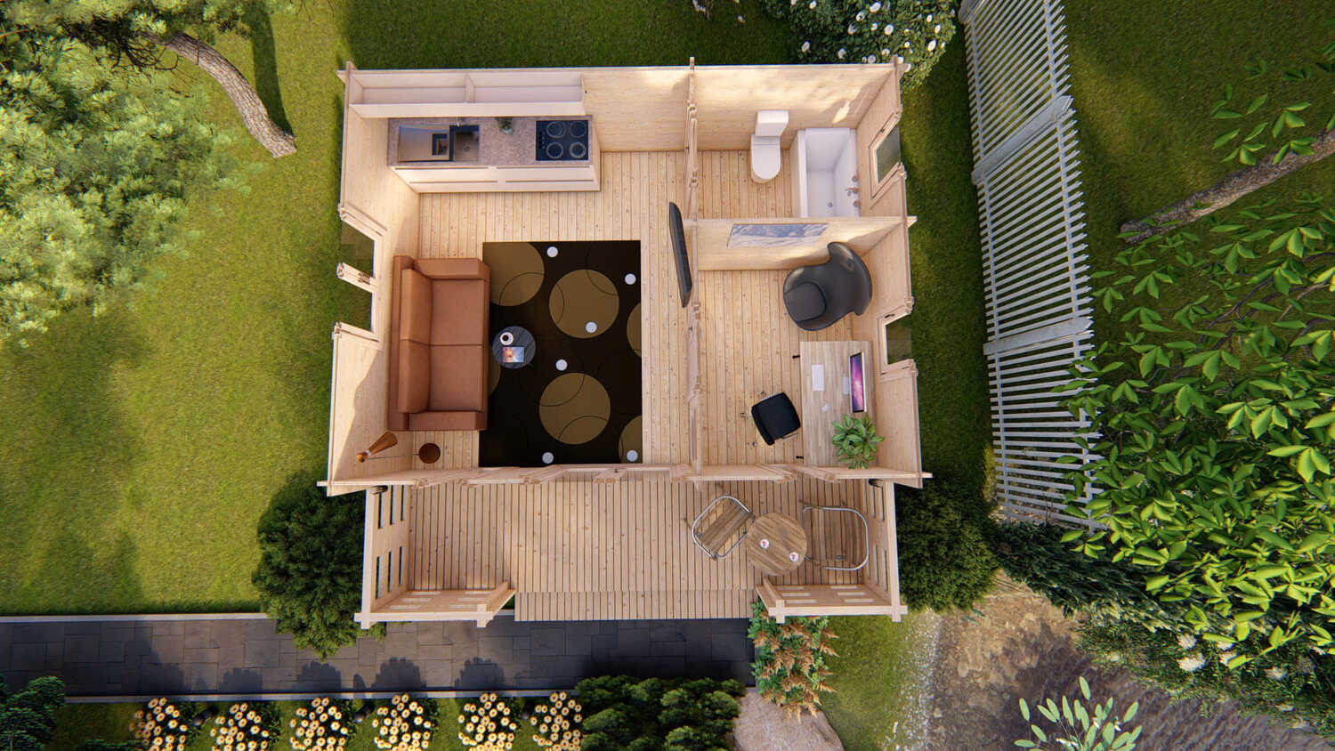 Esta casa de verano de 24 m² cuenta con tres habitaciones independientes que pueden destinarse a sala de estar, dormitorio y baño. Además, incluye una terraza de 1,5 m con un práctico voladizo en el techo. Su diseño ofrece un espacio exterior cómodo, funcional y lleno de posibilidades para disfrutar al máximo del verano.